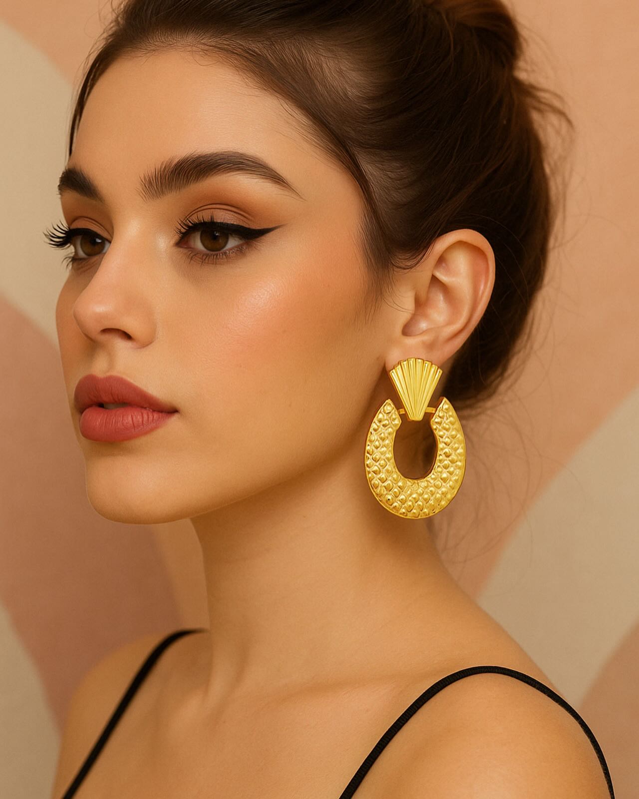 Transform your accessory game with these stunning 18K Gold-Plated Steel Fan-Shaped Textured Hoop Earrings. These earrings combine the elegance of a classic hoop with a bold, fan-inspired design, offering a unique and modern twist.